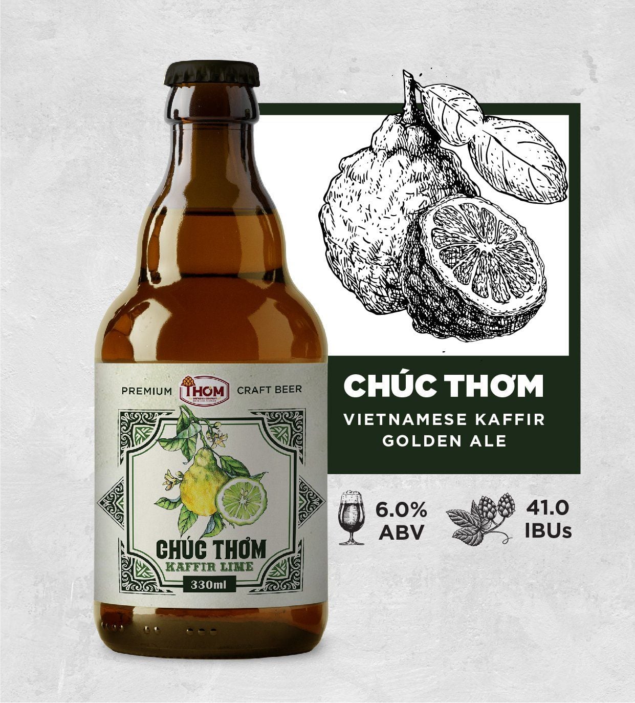 With 6% high in ABV and 40 IBUs, Chuc Thom Beer is the perfect balance of the bitterness from malts and a cool fresh exotic flavor from Kaffir Lime.